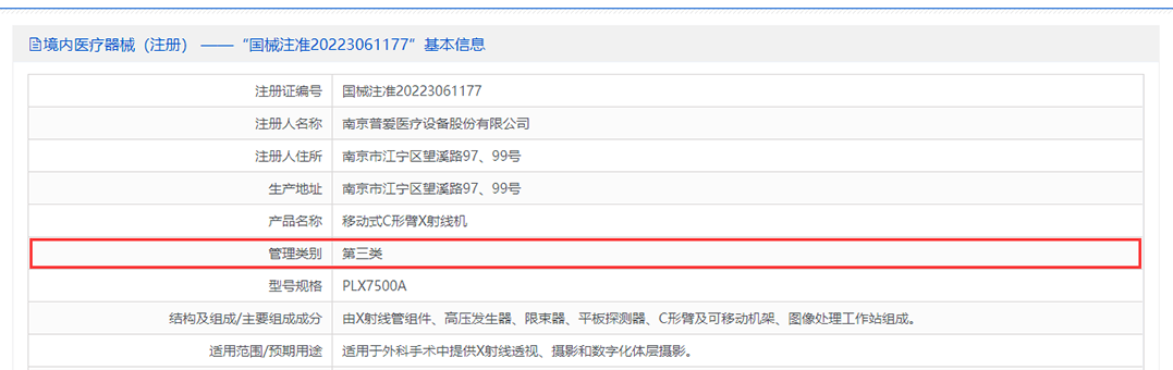《醫(yī)療器械分類目錄》中,“移動式C形臂X射線機(jī)”品類,帶有“數(shù)字化體層攝影“功能的C形臂按III三類注冊證管理,其它用于外科手術(shù)透視及攝影,獲得影像供臨床診斷用的C形臂歸屬II二類注冊證管理。普愛醫(yī)療平板三維C形臂已取得三類醫(yī)療器械注冊證。